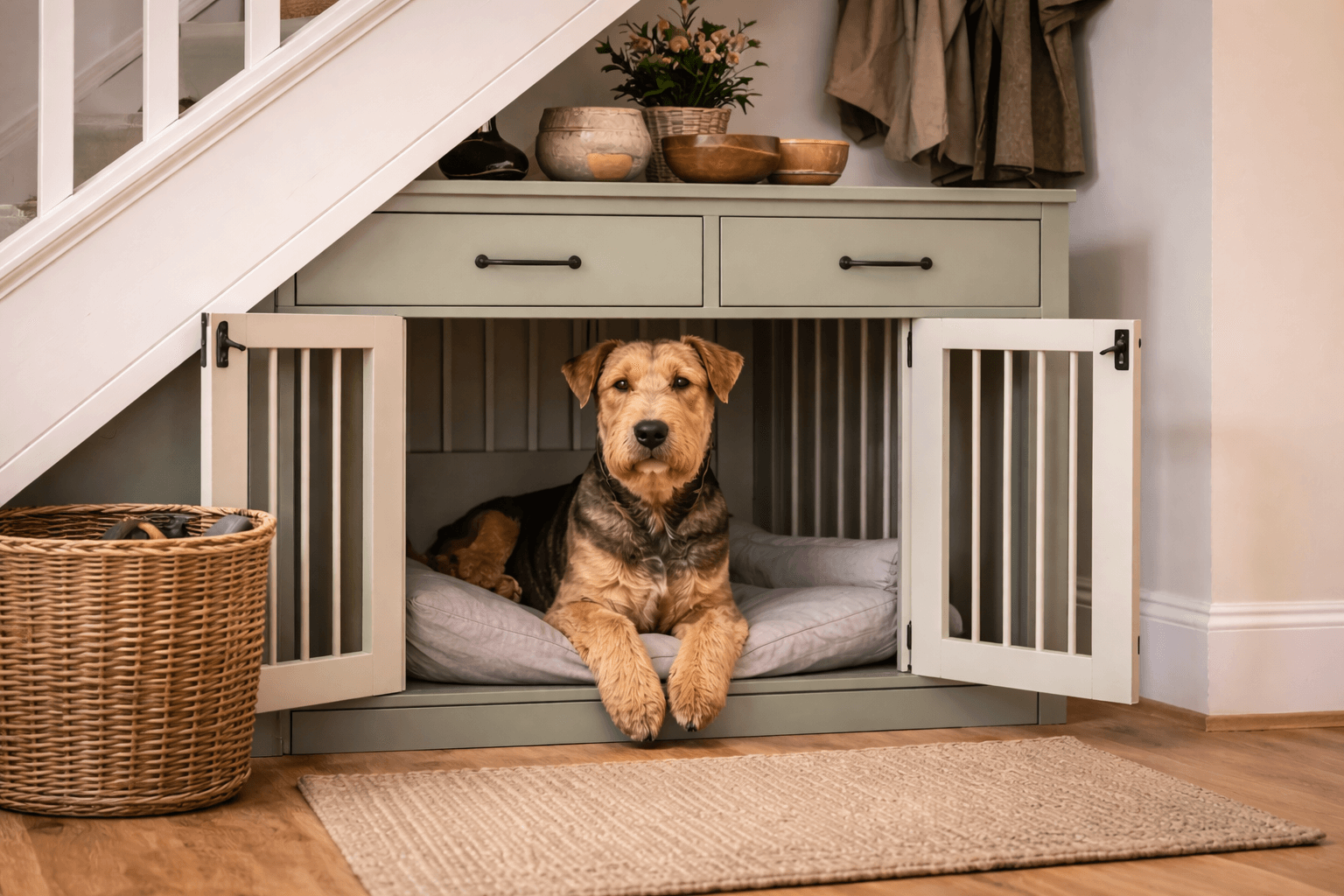 Under the stairs is one of the most underused areas in many homes. A bespoke dog crate can fit neatly into this space, following the angle of the staircase and making use of every inch.