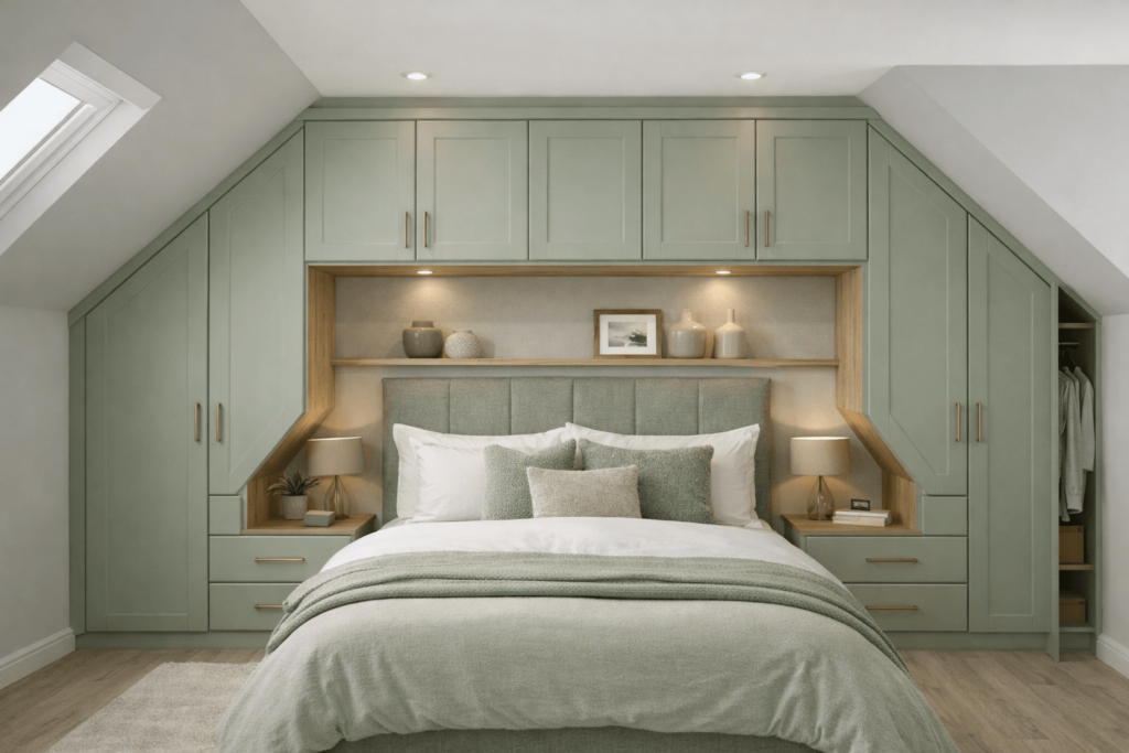 In some loft bedrooms, homeowners even choose around-the-bed wardrobe layouts, allowing storage to run neatly along the wall and above the bed while still following the slope of the ceiling. This approach makes excellent use of wall space while creating a cohesive bedroom design.